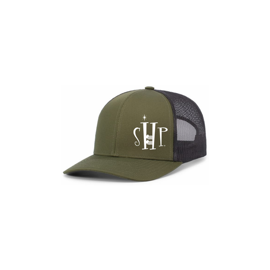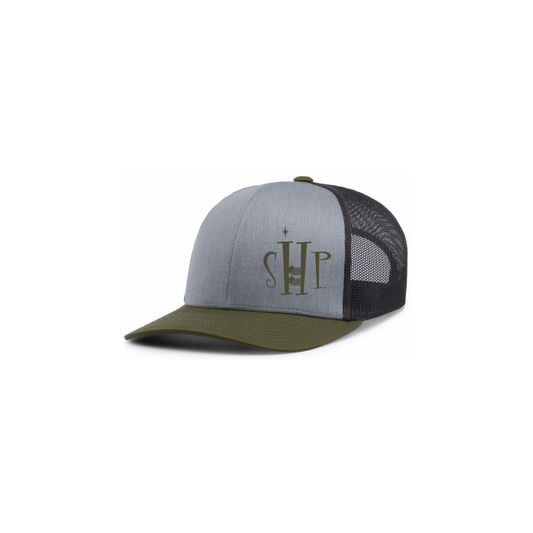 Trucker Snapback Hat w/ Embroidery (MILITARY GREEN/HEATHER GREY/CHARCOAL) - SHP Logo