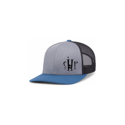 Trucker Snapback Hat w/ Embroidery (OCEAN BLUE/HEATHERY GREY) - SHP Logo